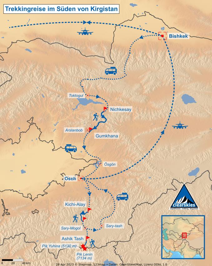 Das Alay-Gebirge bildet die südwestlichste Gebirgskette des großen Tien-Shan Gebirgszug. Im kargen Alay wachsen Großteils Wacholder Bäume und Tien-Shan Fichten. Schon am ersten Trekkingtag überschreiten Sie die Waldgrenze und wandern großteils durch weite und üppige Alm- und Blumenwiesen. Das Alay reicht bis zu 5500 Meter Höhe und dessen Hauptkamm ist stark vergletschert. Im Zuge der 4-tägigen Überschreitung werden Sie 3 Pässe überqueren, mit 4300 Meter ist der Sary-Mogol Pass der höchste Pass dieser Tour. Von der Passhöhe aus genießen Sie einen weiten Rundum-Blick über das langgezogene Alay-Gebirge, das im Süden gelegene Alay-Tal und auf die vergletscherten Gipfel des hohen Pamir.