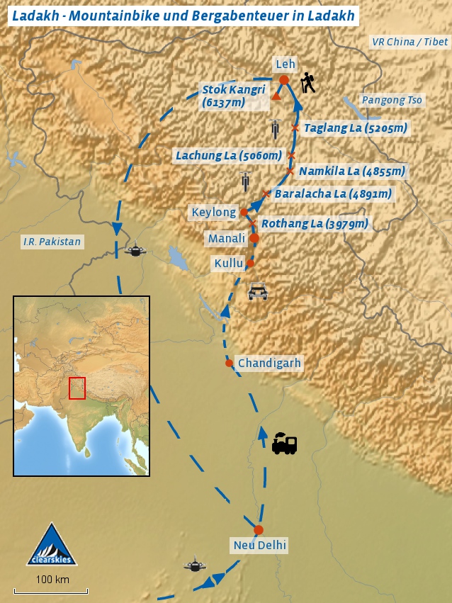 Die anspruchsvolle Fahrt über 6 Pässe führt entlang der Hauptverbindungsstrecke von Manali nach Leh, der Hauptortschaft im nordindischen Ladakh. Die Pässe nehmen während der Fahrt kontinuierlich an Höhe zu, den letzten und zugleich höchsten Pass Taglangla La (5205 m) passieren Sie am 6. Tag der Fahrt. Offiziell ist dies der zweithöchste befahrbare Pass der Welt.