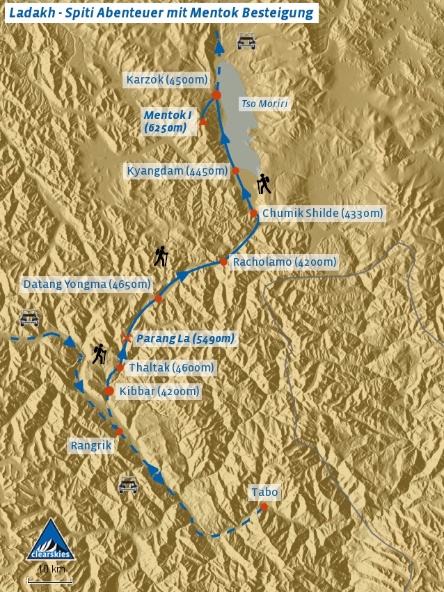Von Karzok wandern wir innerhalb von ein paar Stunden bis zum Basislager des Mentok Peak (ca. 5250 m), wo wir für die nächsten Nächte unser Zeltlager aufbauen und uns auf die Besteigung vorbereiten. Die Besteigung des Mentok beginnt in den frühen Morgenstunden im Schein unserer Stirnlampen.
