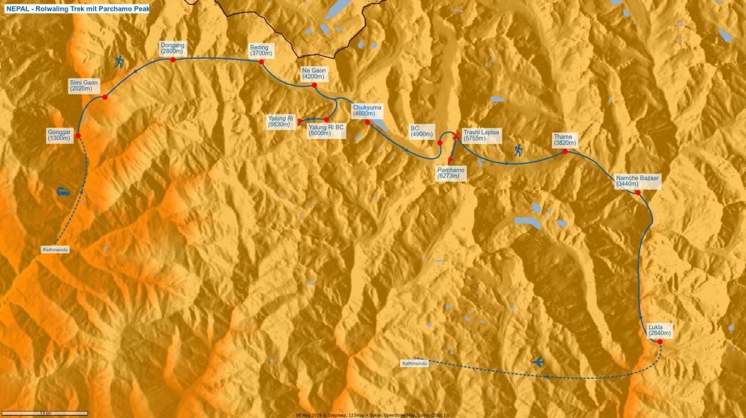Es gilt einen sicheren Weg durch die Spalten und über mehrere Steilstufen (bis ca. 50° Steilheit) zu finden. Bei Bedarf können auch heute wieder Fixseile installiert werden. Der Berg belohnt uns mit einem einzigartigen Gipfelpanorama, das von der Bergwelt des Solu-Khumbu im Osten über das Rolwaling bis in den Langtang-Himal und bei gutem Wetter zur Annapurna-Kette reicht.
