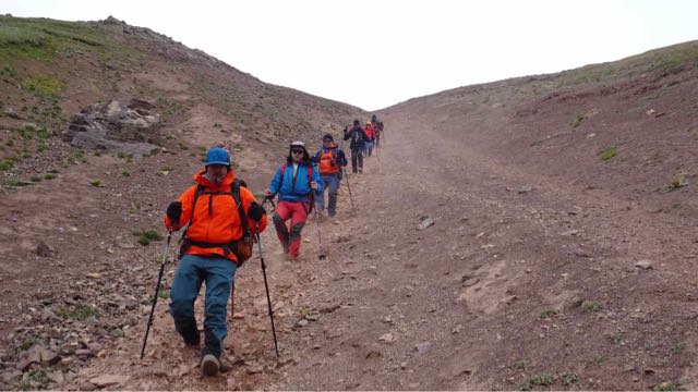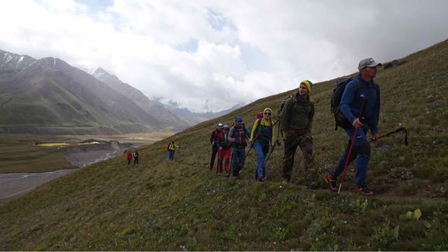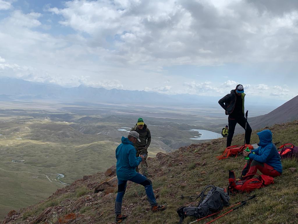 Unseren vorläufig letzten Tag im Pik Lenin Basislager Ashik Tash haben wir heute Vormittag für eine kurze Akklimatisierungswanderung genutzt. Bei leider verhangenem Wetter sind wir nach Westen in Richtung des 4700 Meter hohen Pik Petrovsky gestartet. Der Gipfel war nicht unser Ziel, sondern nur ein Aufstieg von ein paar Hundert Höhenmeter auf dem langezogenen Rücken, der in Richtung Gipfel führt. So Sind wir bis ca. 1130 Höhenmeter aufgestiegen, bis auf eine Höhe von ca. 4100 Meter. Dort haben wir eine gemütliche Pause gemacht, um unserem Organisums etwas Zeit zu geben, die Höhe zu spüren… ein idealer Anstieg für eine erste Akklimatisierung in Richtung vorgeschobenem Basislager. Mehr Aufstieg hätte lediglich Kraft gekostet, ohne nennenswerten Vorteil für unsere Höhenakklimatisierung…