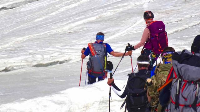 Nach ca. 150 Höhenmeter anstieg kamen wir zu den ersten Steilstufen im Gletscherbruch. Diese Stellen hatten wir schon beobachtet und wussten, dass hier Fixseile sein würden. Leider aber auch, wie so oft, ein entsprechender Stau an den besagten Fixseilen. So beschloß unser Bergführer Wolfi kurzerhand, die erste Steilstufe links zu umklettern. Gesagt getan hatten wir die erste Steilstufe und auch 1-2 kleiner Gruppen überholt. Auch die zweite Stufe konnten wir so rasch umklettern. Wir hatten es war nicht eilig, aber wir wollten eben nicht warten, bis alle Bergsteiger vor uns an den Fixseilen empor kletterten. Das kann nämlich lange dauern, vor allem waren ein paar dabei, die offensichtlich ihre Schwierigkeiten mit Steileis und Einsatz der Frontalzacken ihrer Steigeisen hatten…