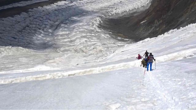 So hatten wir nach einer guten Stunde, den „Crampons Point“ erreicht, den Platz wo wir uns Steigeisen und Klettergurte angezogen und uns auch in 2 Seilschaften angeseilt haben.
