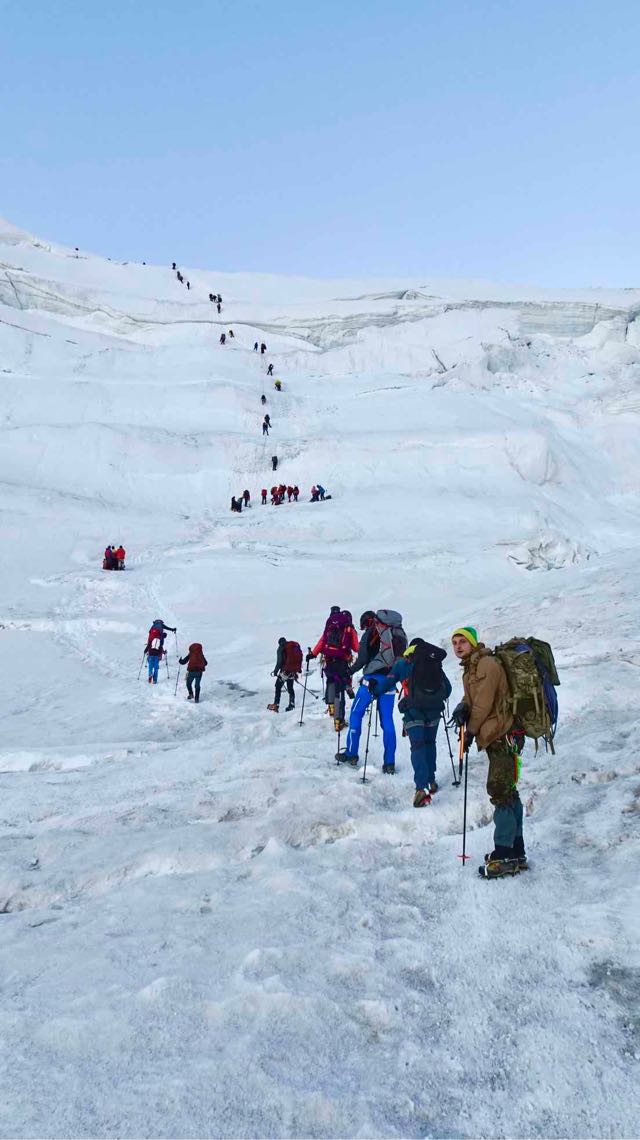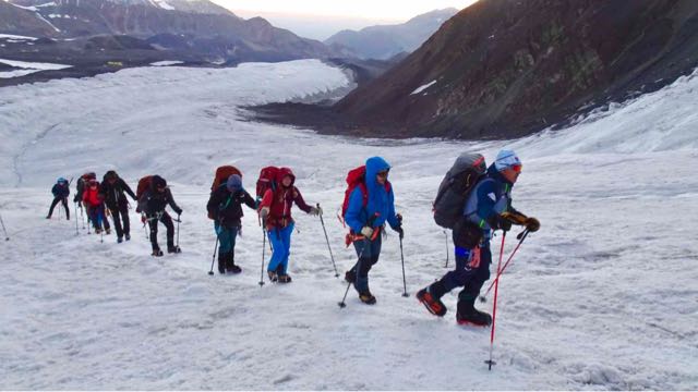 Hannes sendet einen Rückblick auf den gestrigen Tag: Wie geplant sind wir gestern von unserem vorgeschobenem Basislager in das erste Hochlager des Pik Lenin auf 5350 Meter gestiegen. Es war einerseits ein Akklimatisierungsaufstieg, aber natürlich auch ein wichtiger Materialtransport: wir haben Zelte, Kocher und Gas sowie ein paar weitere kleine Dinge ins Lager gebracht und dort deponiert.