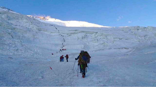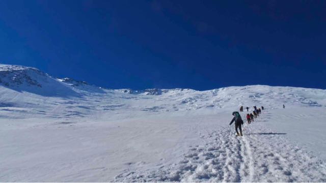 Mit regelmäßigen Pausen ging es weiter rauf, immer wieder über Schneebrücken steigend. Mit zunehmenden Temperaturen.