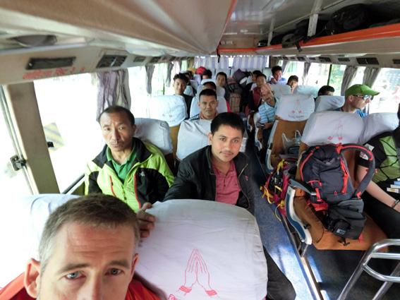 Um 0730 sind wir in Begleitung unserer 12-köpfigen Trekkingcrew von Kathmandu aus gestartet. Wir sind mit einem typisch nepalesischen Bus gefahren, Gepäck am Dach und im Fahrgastraum, ein eher langsames aber unverwüstliches Ungetüm, was wir auf den heutigen Straßen auch benötigt haben.