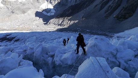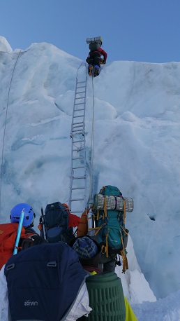Diese Etappe ist einfach und kurz, für mich mit dem nach wie vor schwerem Rucksack nur knapp 3 Stunden, und führt durch und über sehr großen Gletscherspaltenzonen. Waren im Khumbu Eisbruch die Leitern eher klein, so hatten wir hier sehr lange, teils bis zu 10 Meter lange, waagrechte Leitern zu queren. Da man hier auf die einzelnen Sprossen schauen muss, muss man natürlich auch in den Abgrund darunter blicken, der teils 50 Meter oder noch tiefer ist… nichts für Schwindelanfällige.