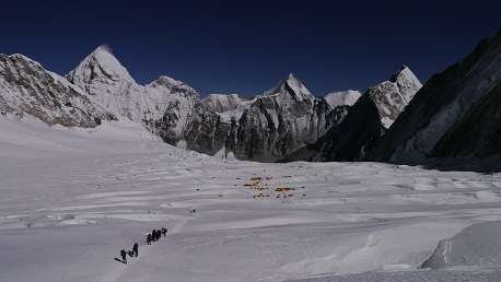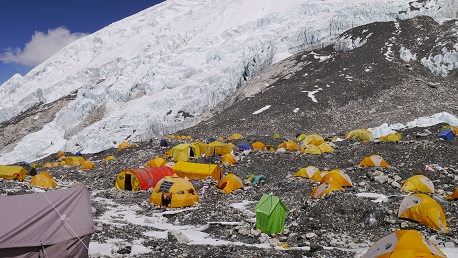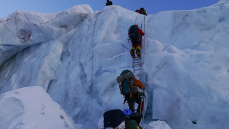 Am Freitag (29.04.2017) sind wir frohen Mutes um 06:00 Uhr nach einem raschen Frühstück in unserer erste „Rotation“ gestartet. Das soll heißen, dass wir zum ersten Mal mit voll gepackten Rucksäcken (ca. 20 Kg pro Person) durch den berühmt-berüchtigten Khumbu-Eisfall zum Lager 1 aufgestiegen sind.
