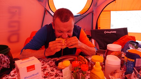 Wobei für mich hier auch einfach Nahrungsaufnahme an erster Stelle steht! Es fällt mir schwer, ich denke wie den meisten Höhenbergsteigern, am Berg annähernd genug Energie in Form von Nahrung aufzunehmen. Das Kochen ist nicht unbedingt einfach, der Appetit nicht unbedingt gegeben, der Körper benötigt alleine für den Grundumsatz ein Vielfaches dessen, was er auf unseren normalen Höhen um 500 oder vielleicht 1000 Höhenmeter über dem Meeresspiegel benötigt. Schon auf Basislagerhöhe von ca. 5300 Meter kann ich quasi essen „was ich will“, ich nehme konstant ab. Auf 6500 Meter, noch dazu unter Anstrengung mit einem schweren Rucksack ist die Energierechnung jedenfalls stark negativ! Deshalb jetzt so gut es geht auf Vorrat Energie bunkern. Und es macht ja auch Spaß so richtig reinzuhauen, vor allem wenn es gute Sachen von einem guten Koch gibt.