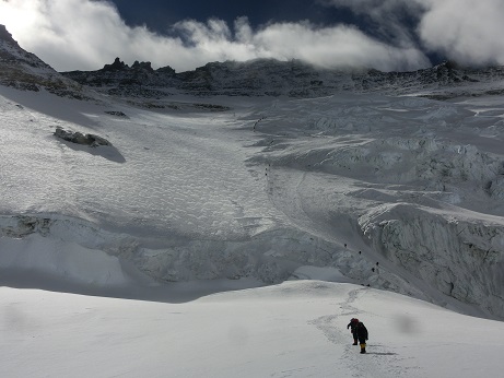 Für den Großteil der Touristen und vor allem für die vielen Sherpas ein extrem langsames und mühsames Unterfangen. Eingepackt in Ihre dicken Daunenanzüge, flankiert von Sherpas vorne und hinten und teilweise ab dem Lager 2 mit Sauerstoff aus der Flasche unterstützt, stapfen sie langsam nach oben. Teilweise fragen wir uns schon, was wir hier sollen ….