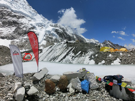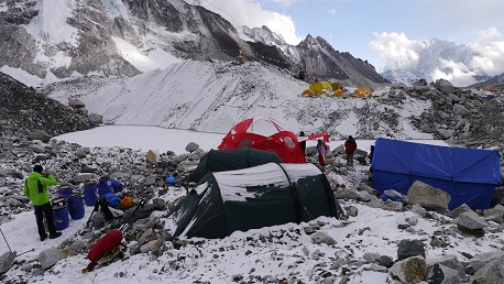 Das gesamte Basislager ist auf dem Khumbu Gletscher gebaut. Auf einer Art Seiten-Moräne bzw. auf einem schuttbedeckten Teil der Gletscherzunge, die sich unterhalb vom Khumbu Eisfall ca. 10 km nach Süden erstreckt, vorbei an Gorak Shep und an Lobuche.
