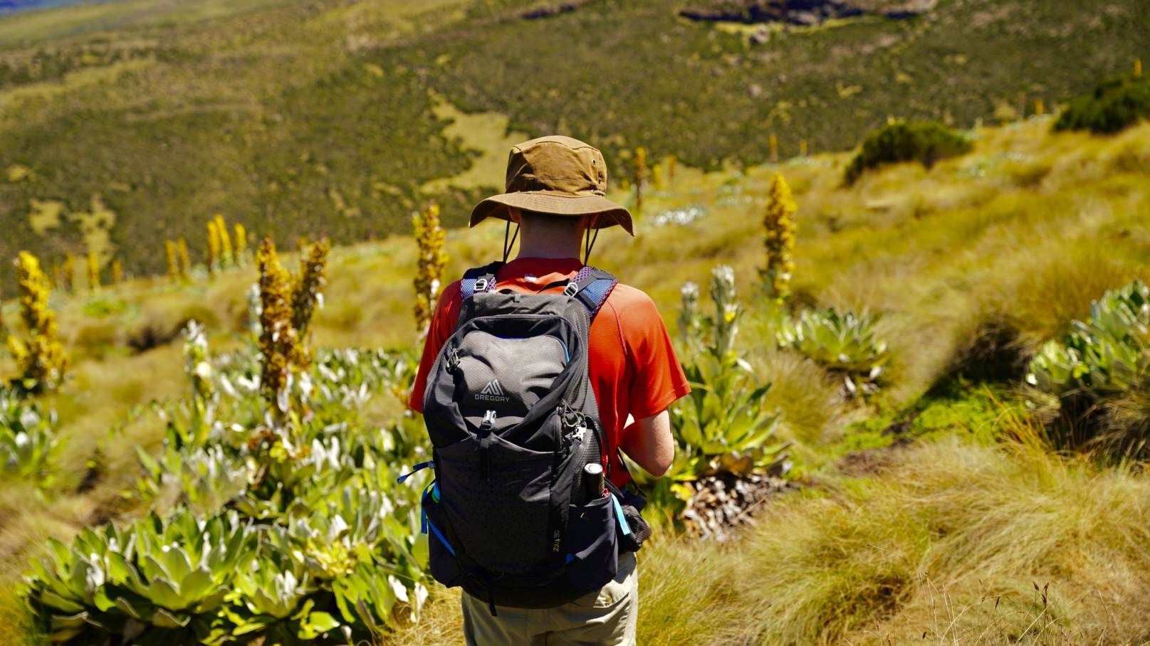 Vom Old Moses Camp sind wir gerade nach Osten aufgestiegen, bis wir nach einer knappen Stunde die Abzweigung zum Liki Northern Camp passiert haben. Hier sind wir dann nach Süden weiter, sanft ansteigend an zwei schönen Bächen vorbei, bis wir einen Rücken erklommen haben. Von diesem Bergrücken aus haben wir dann bei einer Mittagsjause das Panorama in die spektakuläre Mackinders-Schlucht genießen können.
