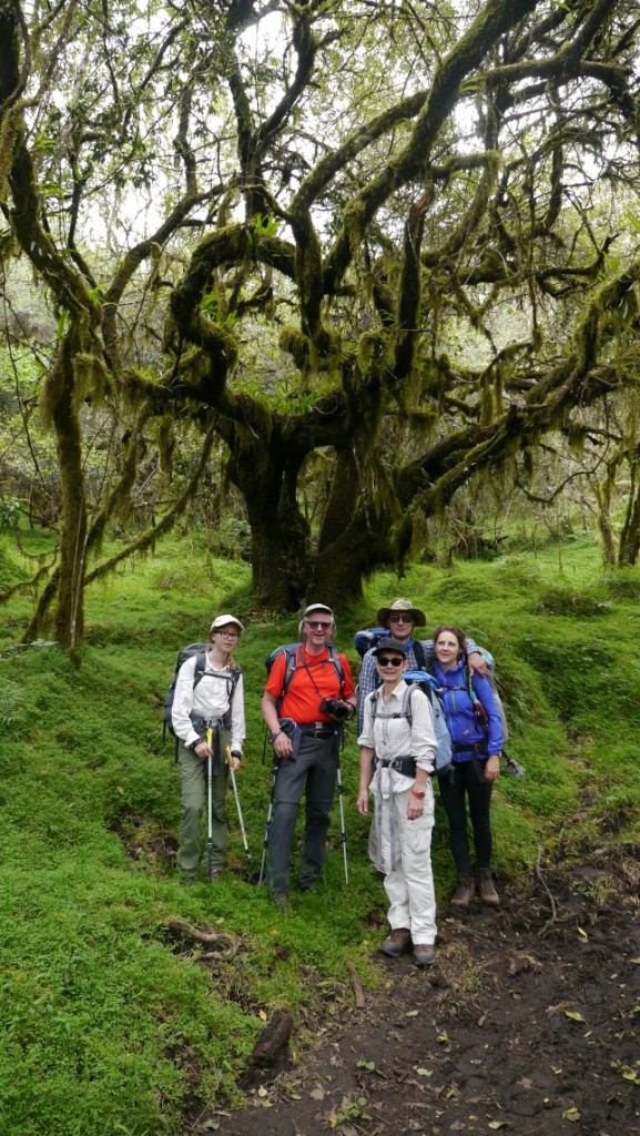 Nach unserer Registrierung haben wir unseren Ranger ‚Good luck‘ kennen gelernt, der uns zusammen mit unseren Guides George und Jonas begleiten wird. In knapp 4 1/2 Stunden sind wir gemütlich und mit einigen Pausen zur Miriakamba Hütte auf 2400m gewandert. Der Aufstieg führt zunächst durch hügeliges Grasland, vorbei an zahlreichen Giraffen, Zebras, Pavianen und Warzenschweinen. Anschließend geht es teilweise recht steil durch üppigen Regenwald hinauf. Beim schweisstreibenden Aufstieg blieben wir weiterhin vom Regen verschont und die sonne brannte teils recht stark auf uns herab.