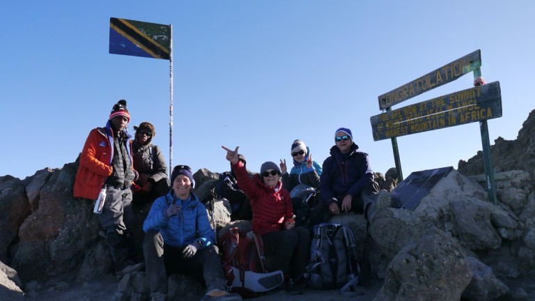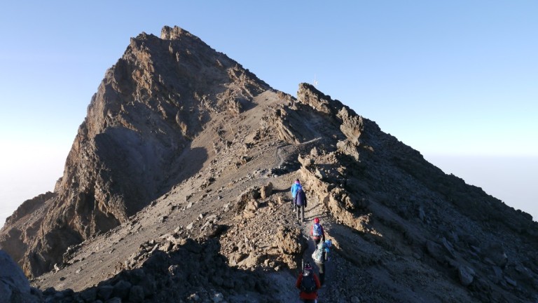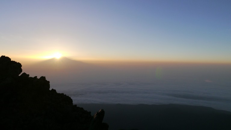 Um halb 7 Uhr dann endlich am Horizont, direkt über dem Kilimanjaro ein traumhaft schöner Sonnenaufgang und endlich etwas Wärme. Die ersten Gruppen kommen uns bereits vom Gipfel, den Sie noch bei Dunkelheit erreicht hatten, entgegen. Uns stehen noch die letzten felsigen Höhenmeter bevor, die wir aber im Licht und der Wärme der Morgensonne absolvieren.