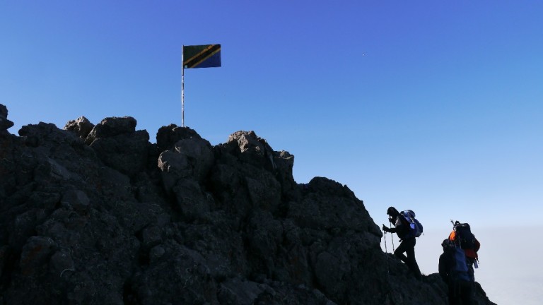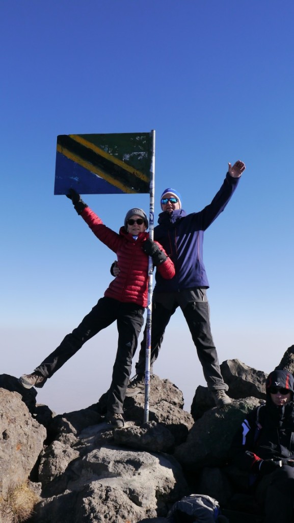 Ziemlich geschafft, aber sehr stolz und glücklich erreichen wir um knapp vor 8 Uhr die tansanische Fahne, die den Gipfel des Mt. Meru, den 5.höchsten Gipfel Afrikas, markiert. Unsere Guides singen uns auf den letzten Metern sogar noch ein Ständchen.