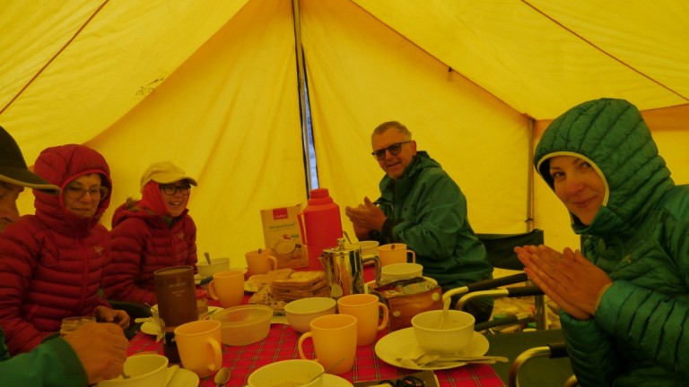 Langsam bekommen wir in unserem Tagesablauf eine gewisse Routine. 0630 Uhr Tagwache, um 7 Uhr gibt es heisses Wasser für unsere Morgentoilette und um halb 8 sind unsere Taschen fertig gepackt und das Frühstück bereit. Während wir uns unsere Morgenstund von Jentschura, den Kaffee von unbound und weitere Köstlichkeiten von unserem Koch Juma schmecken lassen, baut unsere Mannschaft bereits das Lager ab.