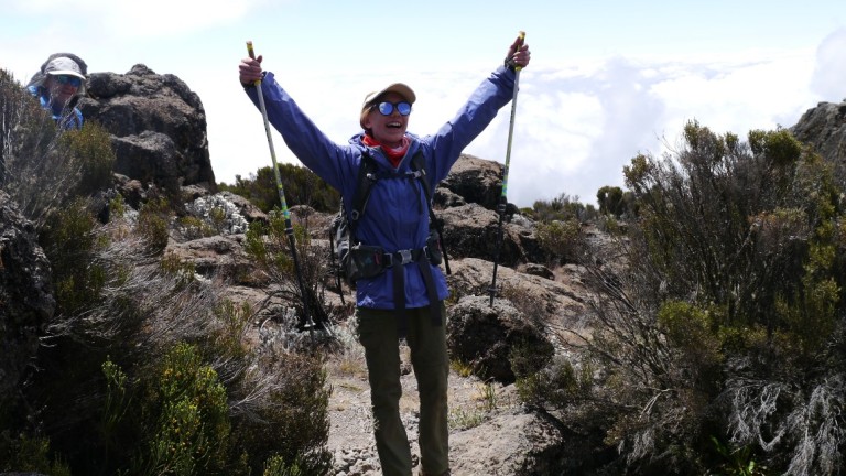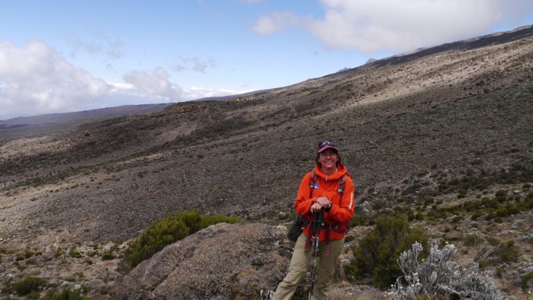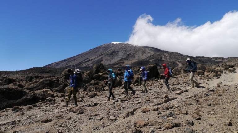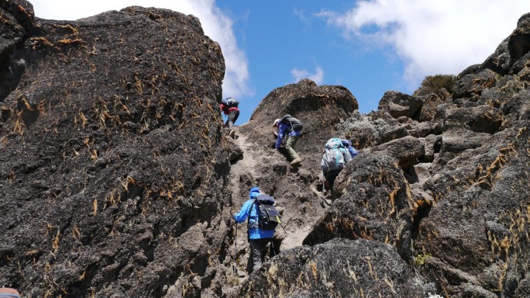 Über uns schwarze Felswände und darüber der schneebedeckte Kibo, unter uns ein Wolkenmeer über der kenianischen Ebene. Heute Morgen könnten wir noch einen letzten Blick zurück auf den Mt. Meru werfen, am Nachmittag blitzte schon der Mawenzi vor uns zwischen den Felsen heraus.