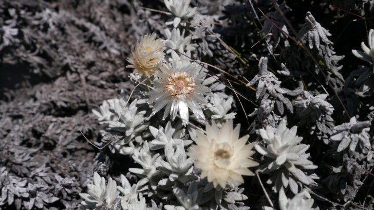 Wir wandern in stetem Auf und Ab durch die karge Lava Wüste, entdecken unterschiedliches Lava-Gestein wie Basalt, Tuffstein oder auch schön glänzenden Obsidion. Zwischen den Steinen kämpfen sich immer wieder bunte Blumen durch.