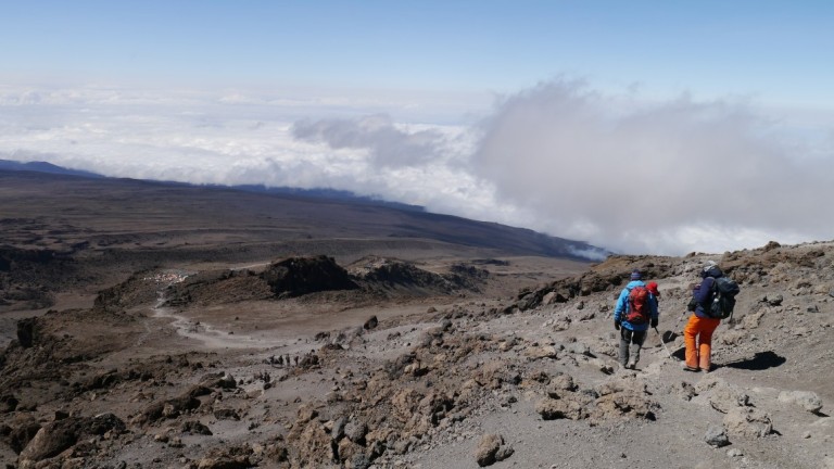 Zurück zum Stella Point und den steilen Schotterweg abwärts in Richtung Barafu Camp. Hier kommen uns noch viele weitere Trekker entgegen. Uns wird heute so richtig bewusst, wie einsam wir die letzten Tage verbracht haben.
