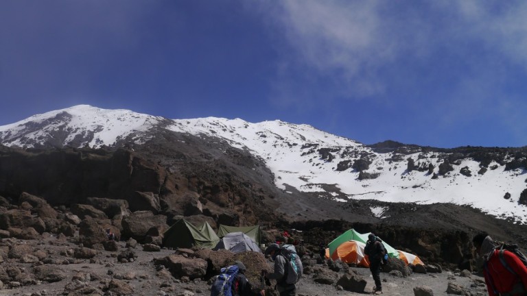 och eine letzte Rast im riesigen Barafu Lager, ein Blick zurück auf die verschneite Südseite des Kilimanjaro und dann verlassen wir auch schon die Vulkanwüste und steigen zum Millennium Camp ab. Die immer dicker werdende Luft lässt uns aufatmen und die Kleiderschichten werden nach und nach weniger.
