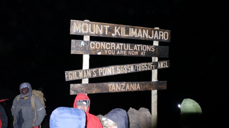 Endlich, um knapp vor 6 Uhr klettern wir die letzten Felsen zum Gilmans Point hinauf. Am Horizont beginnt es langsam zu leuchten. Oben erwartet uns ein erstes Schild, gilt doch dieser Punkt bereits als Gipfelsieg. Ausserdem erwarten uns einige andere Gipfelaspiranten, die hier ebenfalls eine Rast einlegen.