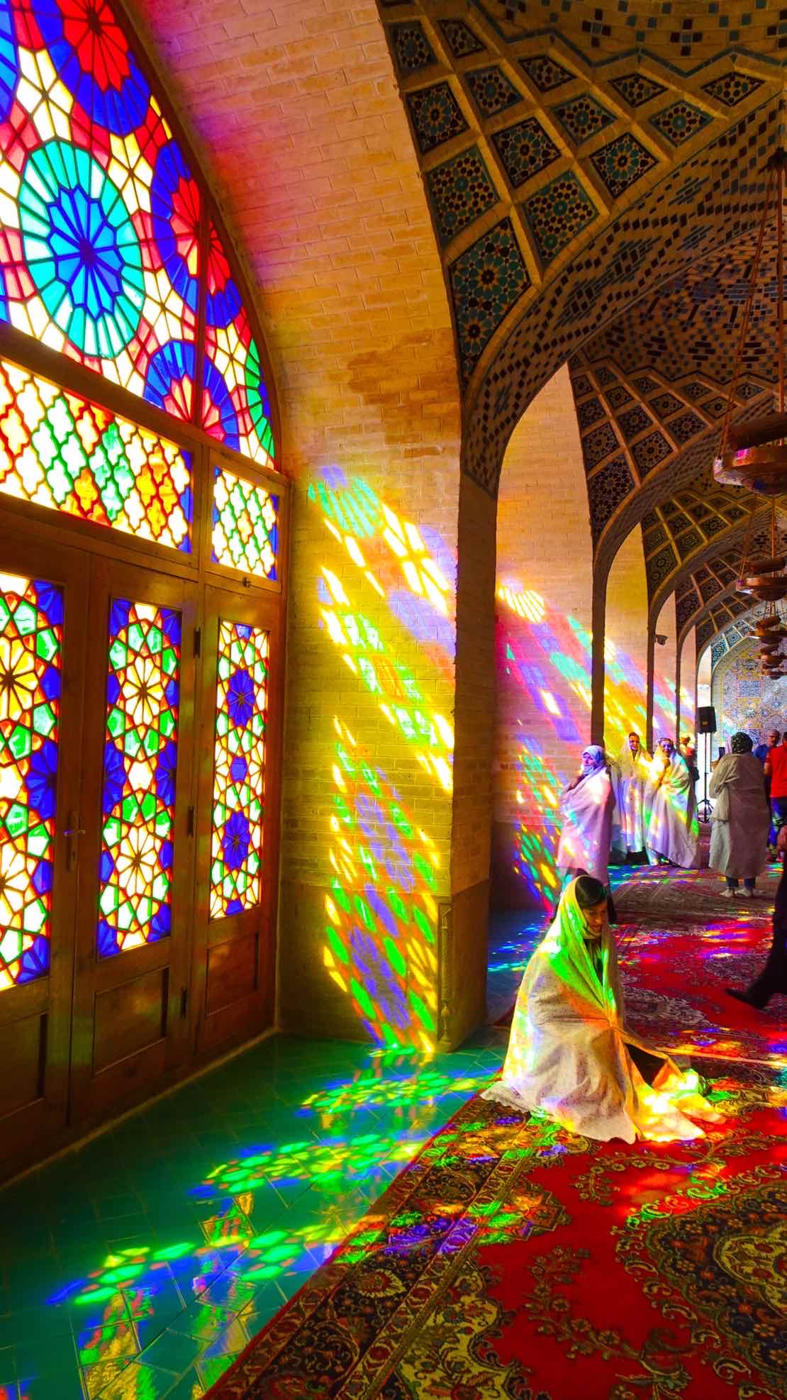 In der Nasir-al-Mol Moschee, die sich Pinke Moschee genannt wird, auf Grund der vielen rosaroten Verziehrungen, gibt es einen berühmten Saal, in dem das Licht durch viele bunte Fenstergläser dringt, und somit den Säulensaal in vielfärbige Lichtspiele taucht.