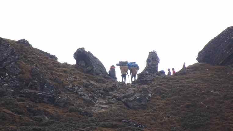 Der kleine Pfad führte uns am Berghang entlang nach Norden, über 2 kleine Sättel, von denen aus man bei gutem Wetter erste schöne Blicke auf den Mera Peak, unserem ersten Bergziel hätte. Auf Grund des Nebels haben wir uns dieses Panorama heute nur vorstellen können.