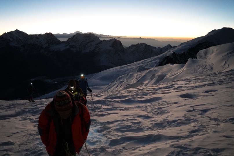 Pünktlich um 0300 haben wir im Schein der Stirnlampen unsere Steigeisen angezogen. Leider hat Didi schon gespürt, dass er es wohl nicht schaffen würde, so sind wir zu dritt abmarschiert.