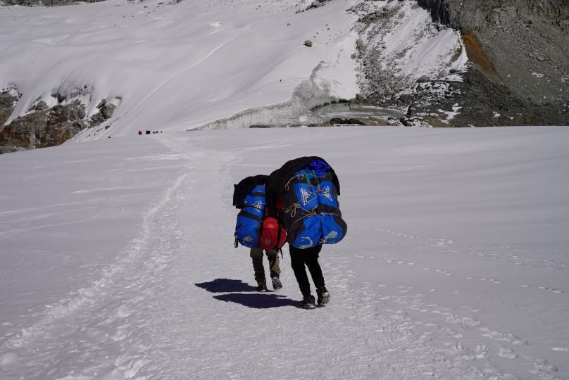 Rasch verliessen wir den Gipfel und machten uns auf den langen Abstieg. Das Hochlager erreichten wir schon gegen 0915 und unser Koch Dendi empfing uns mit einer wohltuenden Tasse warmen Zitronensaft. Danach gab es bald eine wärmende und stärkende Nudelsuppe. Nach dem Packen unserer Taschen ging es gegen 11Uhr los und wir verließen das Hochlager und stiegen am Gletscher ab bis zum Mera La Pass.