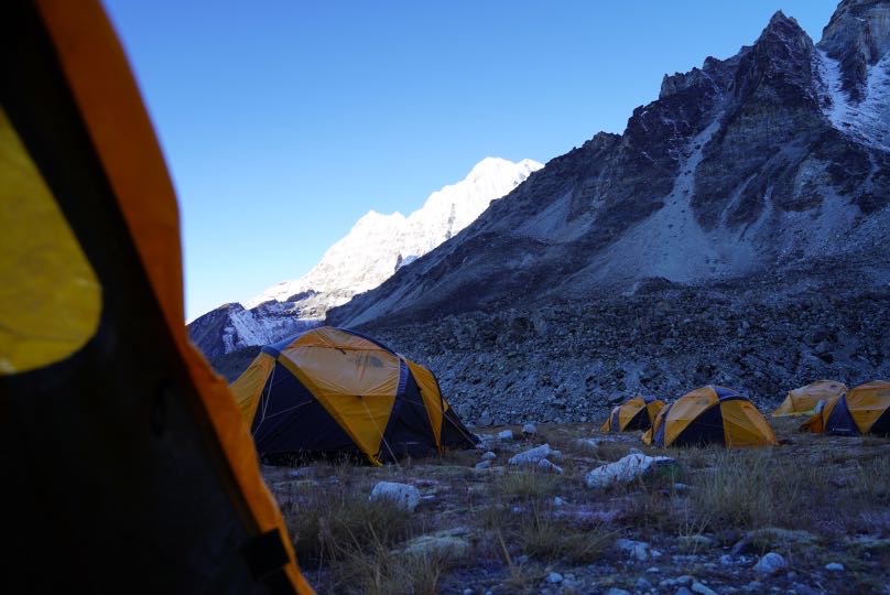 Wir haben unser Lager ziemlich direkt unterhalb des Amphu Lapcha auf ca. 5525 m aufgebaut. Morgen werden wir früh starten, so gegen 0600, den es erwartet uns eine sehr lange Etappe! Erst auf den 5750 Meter hohen Amphu Lapcha, aufs essen Rückseite wir über eine Art neu-errichteten Klettersteig absteigen müssen. Danach ein sehr langer Abstieg über Moränen bis nach Chukhung, wo wir die erste Lodge im hinteren Khumbu erreichen werden.