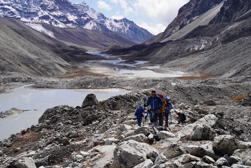 Wir anderen sind das Honku-Tal weiter nach Norden gewandert, immer auf Lhotse und Everest zu. An der Seen-Kette Panch Pokhari („5 Seen“) vorbei und auf einen Moränen-Rücken nach den anderen. Bis wir gegen Mittag das Hochtal unterhalb des Amphu Lapcha La erreicht haben.