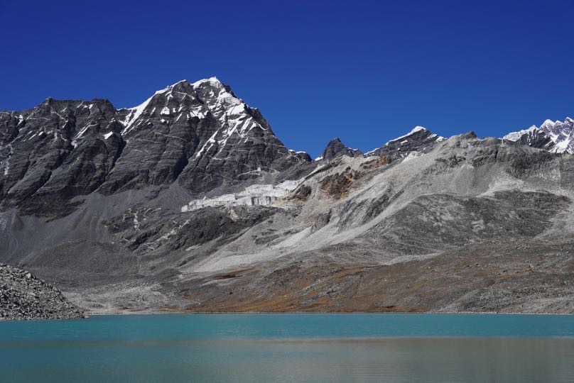 Hier haben wir einen Blick der Extraklasse bekommen: die Felswand des Amphu Lapcha, links davon der charakteristische Stufegletscher, über den wir morgen aufsteigen werden, und im Vordergrund der Türkisblauen Honku-See.