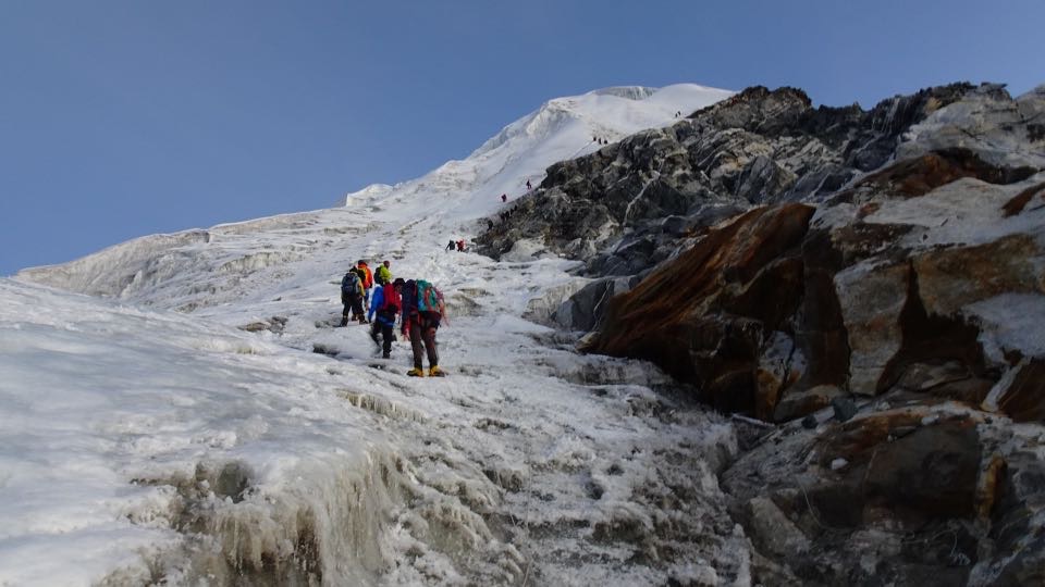 Erstaunlich steil präsentiert sich heuer diese Gletscherpassagen. Mit Hilfe von Steigklemmen und Fixseilen konnten wir relativ sicher aufsteigen. Nun kamen wir zeitweise in den klassischen Stau, da wir die langsameren Gruppen, die teilweise 2 Stunden vor uns gestartet waren, eingeholt hatten.