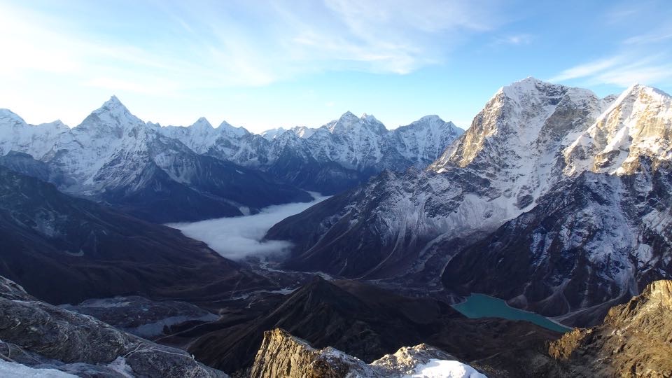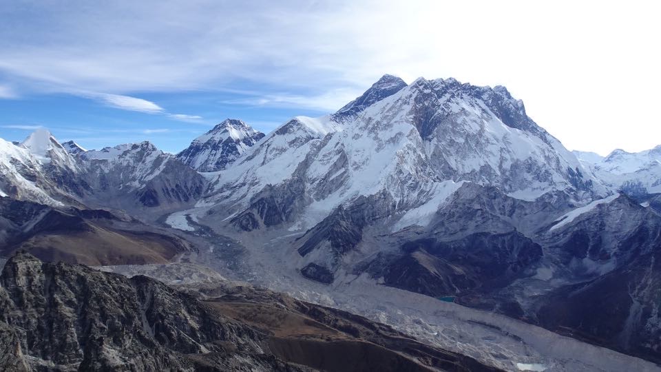 Jedenfalls hatten wir, wie erhofft, einen nahezu perfekten Tag erwischt: warmen Temperaturen, kein Wind (!!) und eine tolle Fernsicht, die uns ein gewaltiges Panorama schenkte. Von der AMA Dablam im Südosten über den massiven Lhotse bis hin zum Everest präsentierten sich die bekannten Gipfel des Khumbu vor uns!