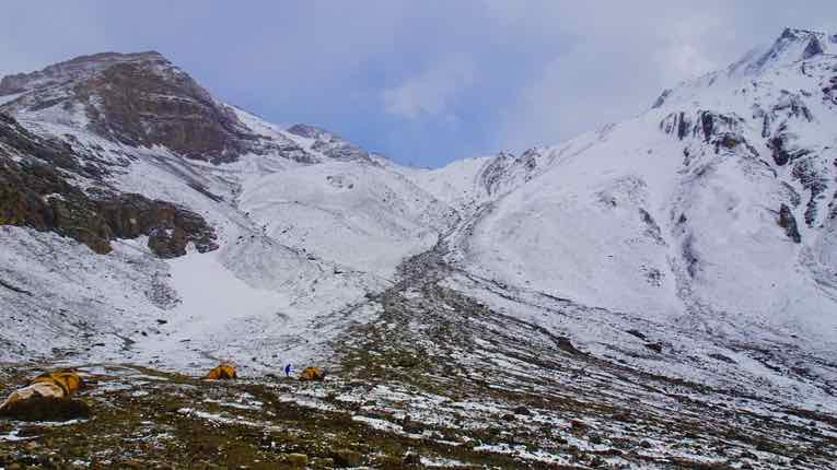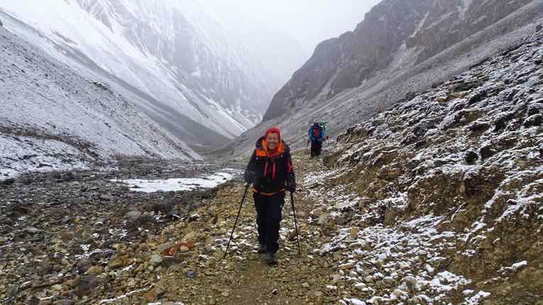 Von unserem Lager am Phoksundo-See sind wir das Tal des Phoksundo Khola entlang gewandert. Über unseren Köpfen die beeindruckenden Hängegletscher des Kanjirowa Himal, des höchsten Massivs in dieser Region (ca. 6600 Meter).