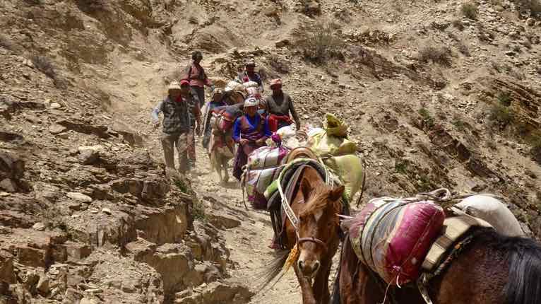 Auch sind uns immer wieder Pferdekarawanen entgegengekommen. Die Menschen im Dolpo sind freundlich und vor allem lustig, lachen viel und freuen sich über uns.
