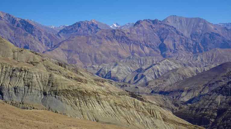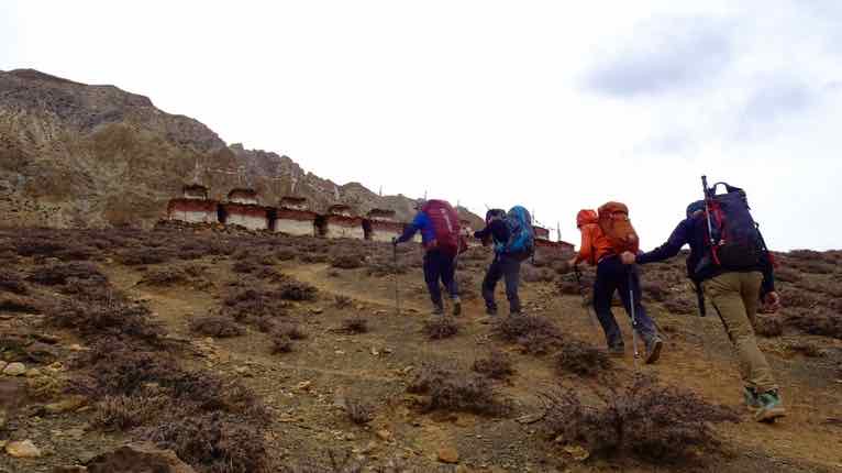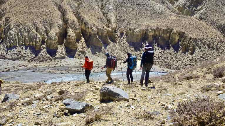 Nach einem gemütlichen Frühstück in der Sonne haben wir Saldang verlassen und sind weiter nach Norden gewandert. Zuerst über die neue Piste, die nur von ganz wenigen Motorrädern befahren wird. Nach einer knappen Stunde, in der wir schöne Ausblicke auf die weite, karge Bergwelt des oberen Dolpo genießen konnten, sind wir zum Bach abgestiegen.