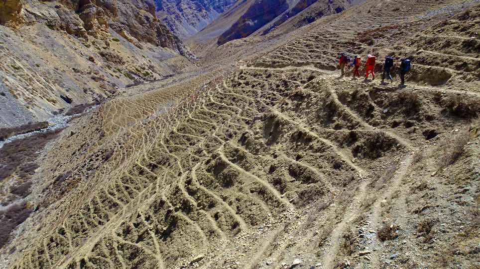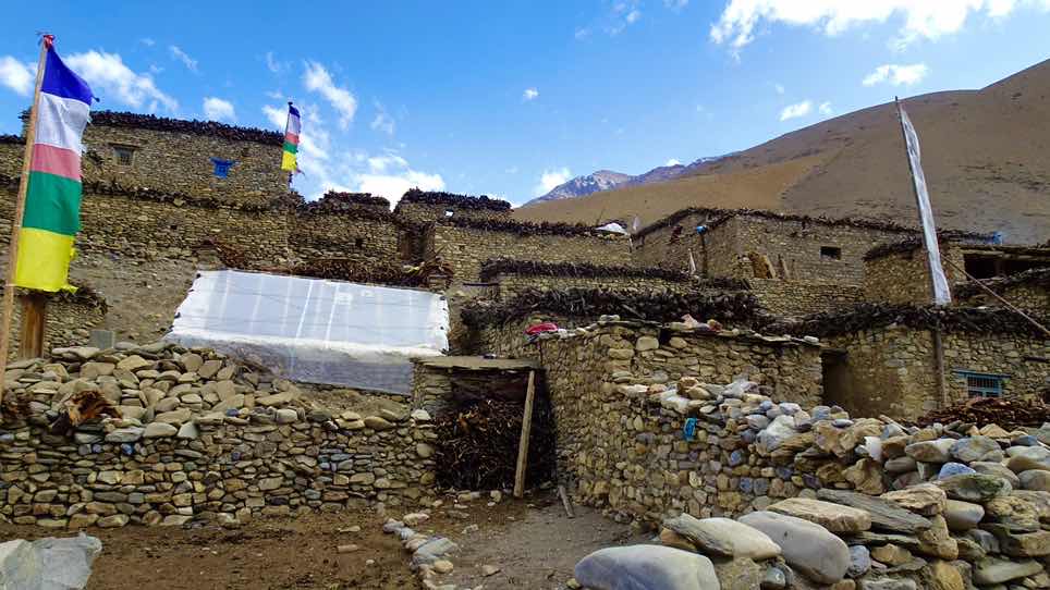 Bei schönem Wetter haben wir Dho Tarap verlassen und sind nach Osten in Richtung des nächsten hohen Passes unserer Tour gewandert. Wir sind an den schönen Natursteinhäusern von Dho Tarap vorbeigewandert, an vielen Schaf- und Ziegenherden vorbei.