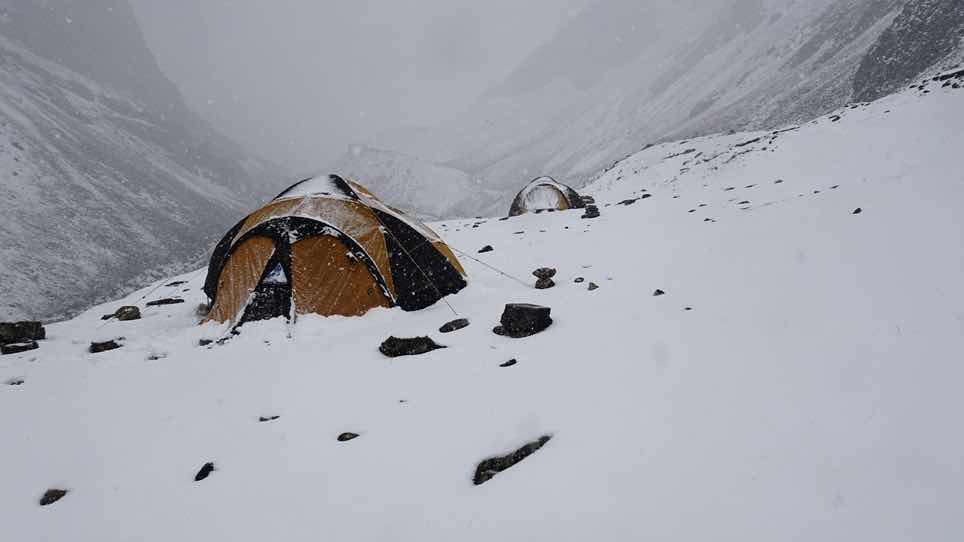Gegen 13 Uhr haben wir schlussendlich unser Basislager erreicht. Gerade rechtzeitig, da es angefangen hatte zu graupeln. Als wir unsere Schlafzelte aufgebraust haben, hat es richtiggehend zu schneien angefangen, auch Donner war zu hören.