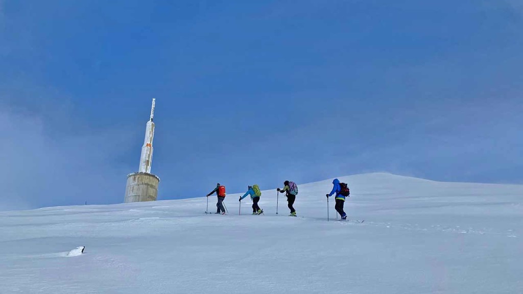 Nach knapp 2,5 Stunden erreichten wir den Trolltinden 850m. Oben ist ein riesiger Turm mit Sendemasten, an dessen Fuss wir eine kurze Mittagspause einlegten. Aber schon bald lockten die unverspurte Hänge zur Abfahrt.