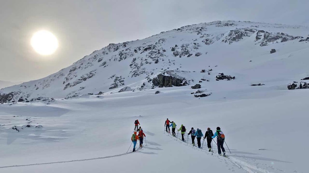 Erst als wir von einem kleinen Sattel den breiten Rücken aufsteigen wollten, frischte der Wind kräftig auf und wir mussten bei teils regelrechten Sturm den sehr abgeblasenen Hang aufsteigen. Jetzt konnten wir die diese Woche gut trainierten Spitzkehren nochmals üben ;-) und sogar unsere Harscheisen kamen zum Einsatz. Nach knapp 500 Höhenmetern war klar, dass uns der Gipfel heute verwehrt bleiben würde, zu wenig Schnee und zu viel Wind. Auf einem Zwischenplateau machten wir kurzerhand eine Gipfelpause und fuhren anschließend durch den felsdurchsetzten Hang ab.