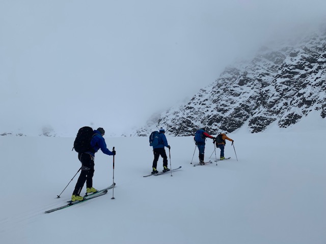 Die Wolken wurden immer dichter und die Sicht schlechter aber trotzdem haben wir alle eine kurze Skitour mit oder ohne Gipfel absolviert und sind anschließend in gutem Schnee bis zum Strand abgefahren.