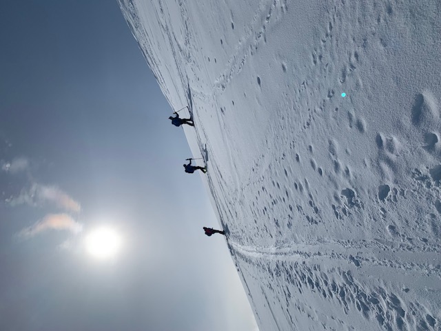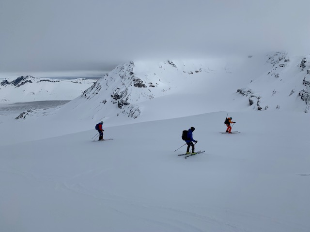 Vom Strand ging es in einem weiten Bogen und wieder einmal über einen langen, flachen Gletscher hinauf. Es gab mehrere Tourenziele und Edward unsere Guide hat uns den perfekten Gipfel ausgesucht.
