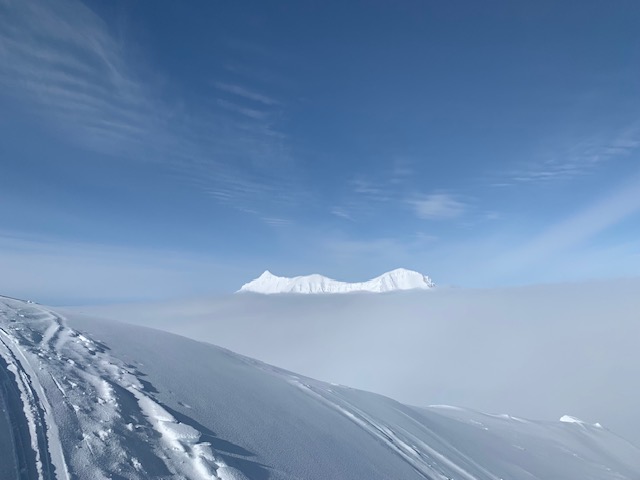 Erst knapp unter dem Gipfel des Dautmannfjellet durchbrachen wir die Wolken und standen bei Sonnenschein und blauem Himmel am höchsten Punkt. Rund um uns ein Wolkenmeer aus dem nur vereinzelt ein paar weitere Schneegipfel herausragten. Ein weiterer traumhafter Tag !