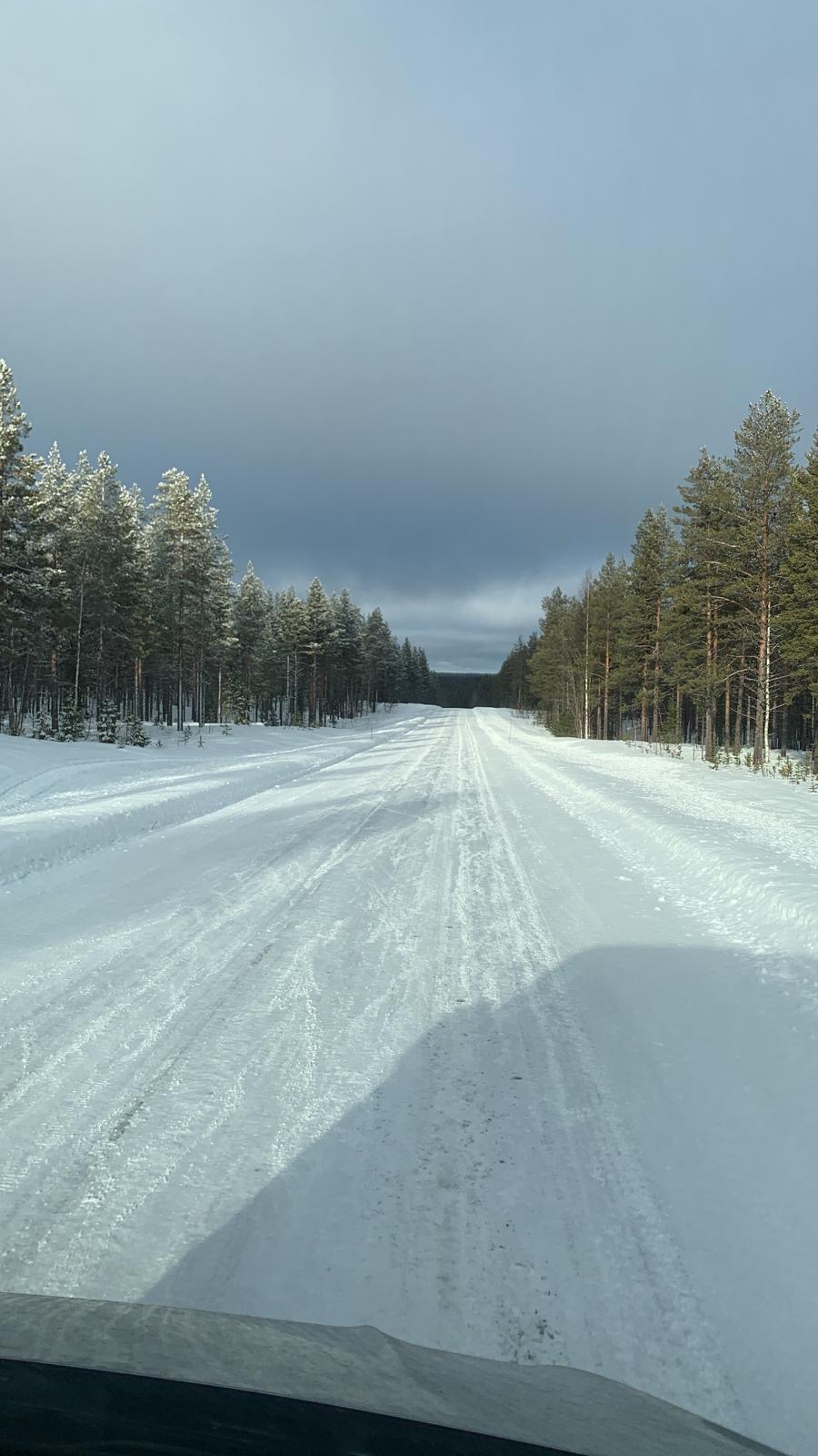 Bei Schnee- und Eisfahrbahn ging es durch den verschneiten Wald entlang der Finnischen Grenze bis zum Grenzort Karesuando, wo man einen Kaffee und ein paar Souvenirs kaufen kann.