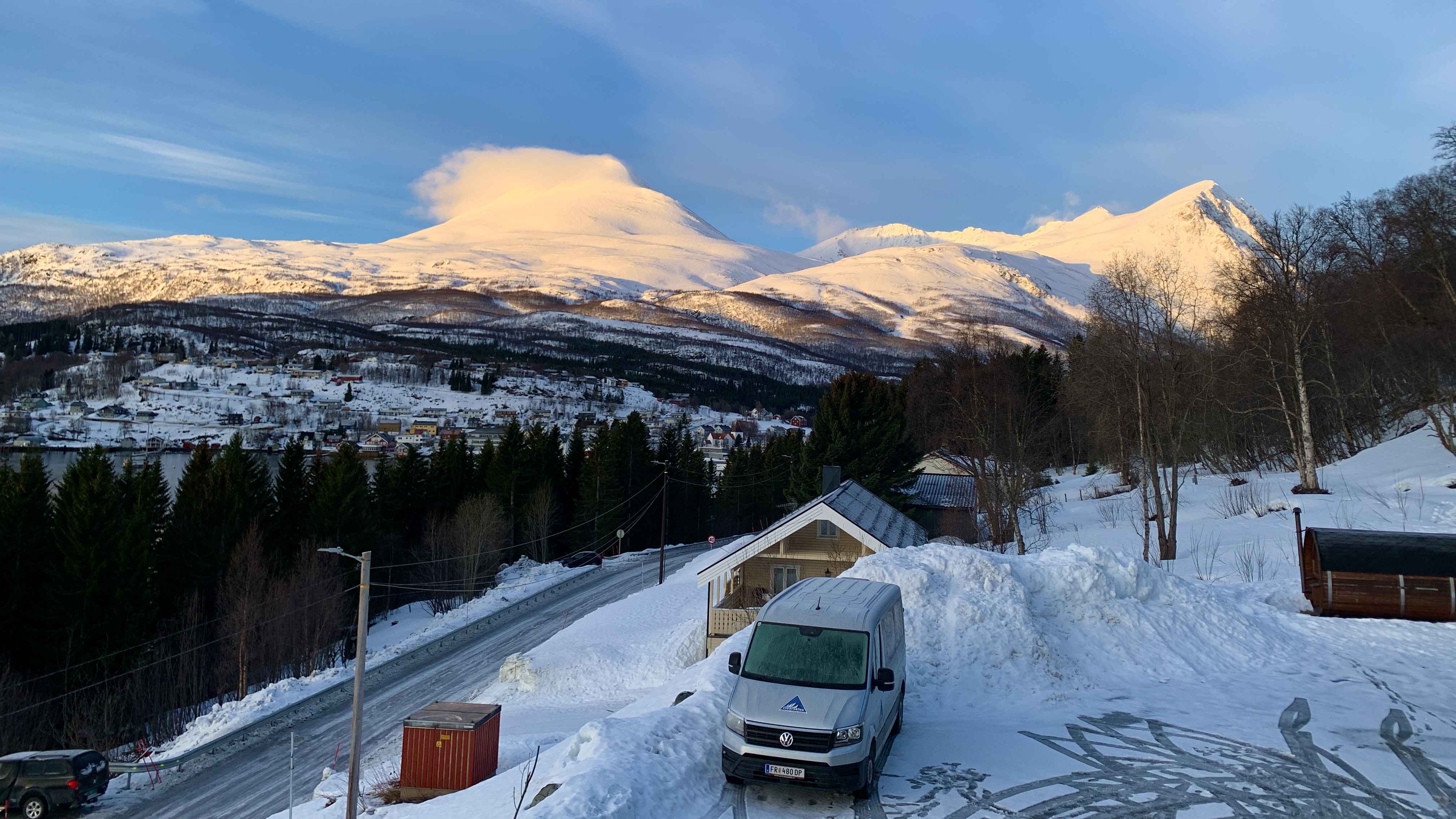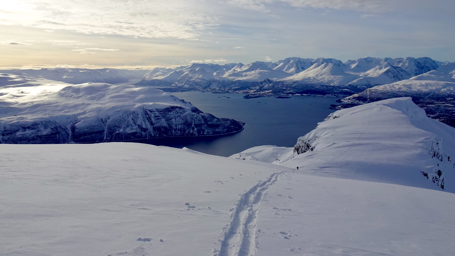 Die Sonne scheint und die Ausblicke auf den Lyngenfjord und die umliegenden frisch verschneiten Gipfel sind atemberaubend.