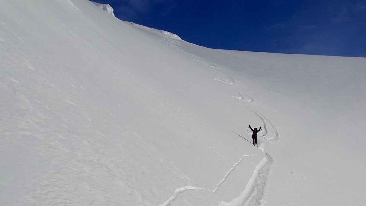 Vom Gipfel dürfen wir die ersten beiden Spuren in den frischen Pulverschnee ziehen und genießen jeden Meter.