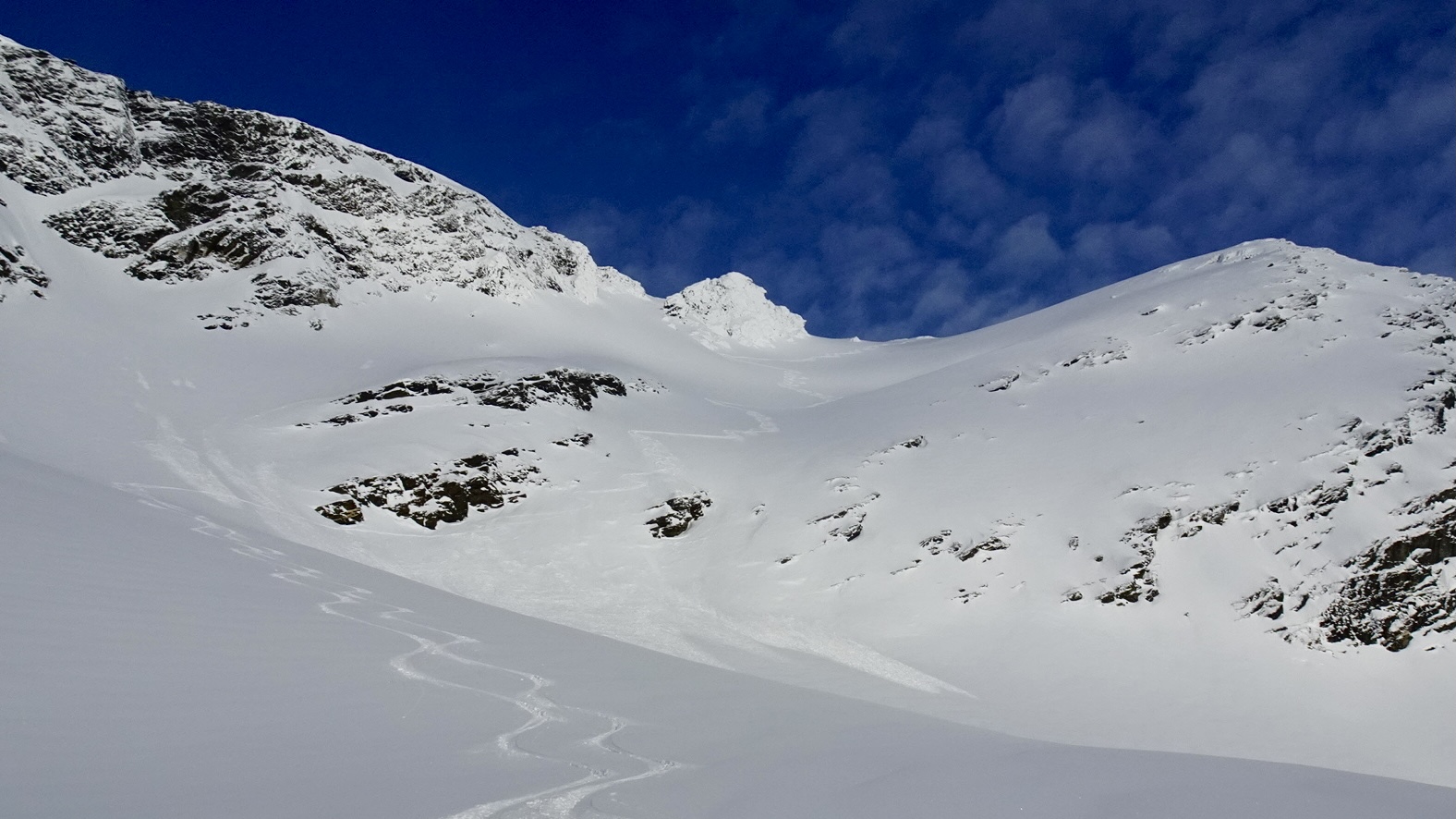Die Abfahrt hinunter versprachen 1000 Höhenmeter schönster Pulver und ließen die Strapazen des Aufstieges schnell vergessen. Ein Traum ! Jetzt war uns auch klar, warum so viele andere den langen und flachen Zustieg auf sich genommen hatten.