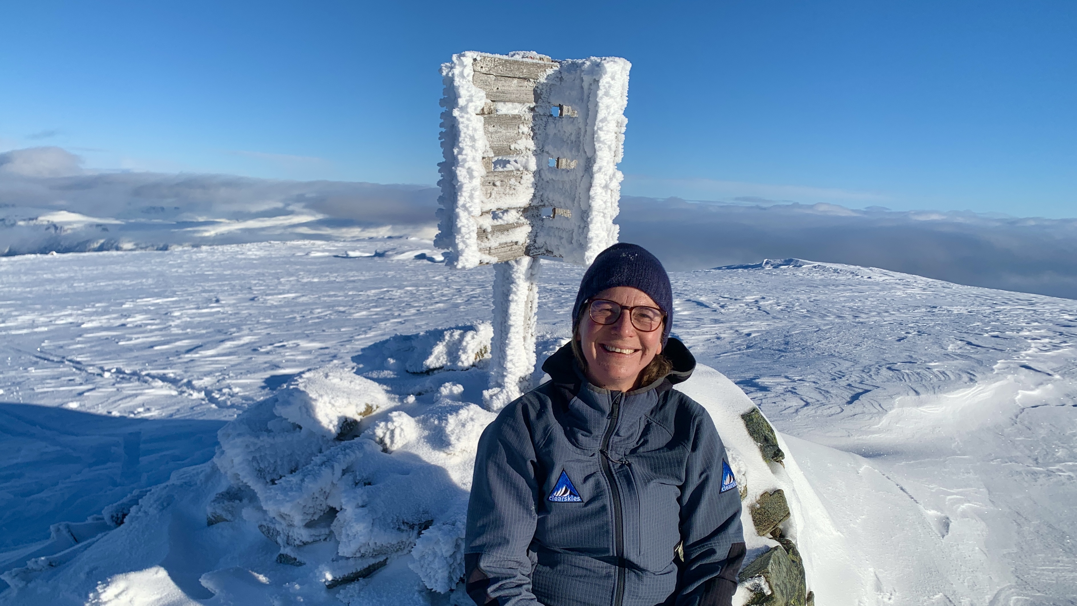 Endlich waren wir am Gipfel und genossen das Panorama. Die Gipfel rund um uns waren durchwegs in Wolken, aber wir standen bei strahlend blauem Himmel in der Sonne.