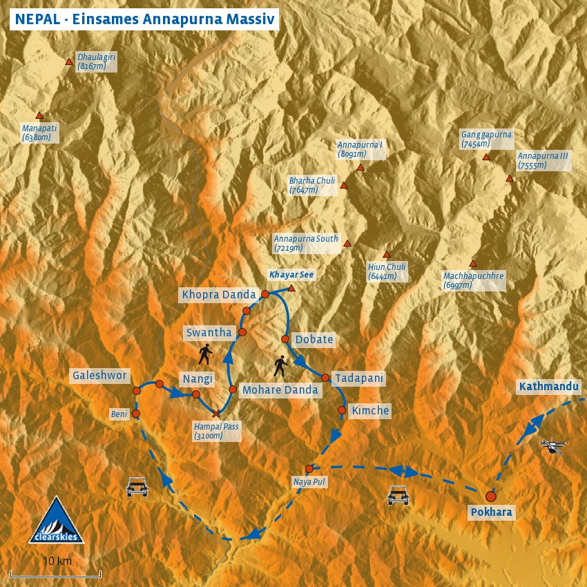 Anfahrt von Pokhara zum Ausgangspunkt unserer Trekkingtour im Kali-Gandaki Tal. Von der kleinen Ortschaft Galeshwor steigen wir nach Osten auf. Im Laufe der ersten 3 Tagesetappen erklimmen wir den Mohare Danda Bergrücken - je höher wir steigen, umso beeindruckender die Berglandschaften um uns herum! Vor allem das breite Massiv des 8167 Meter hohen Dhaulagiri im Westen des Kali-Gandaki Tal zieht immer wieder unsere Blicke auf sich.Der ca. 3300 Meter hohe Mohare Danda ist unser erster beindruckender Aussichtspunkt - von hier aus öffnet sich uns ein 360 Grad Panorama: vom Dhaulagiri im Westen über das breite Annapurna Massiv im Norden bis zum Manaslu im Nordosten. Im Süden ziehen sich die sanften Hügelketten des Himalaya-Vorgebirge bis zur indischen Grenze.